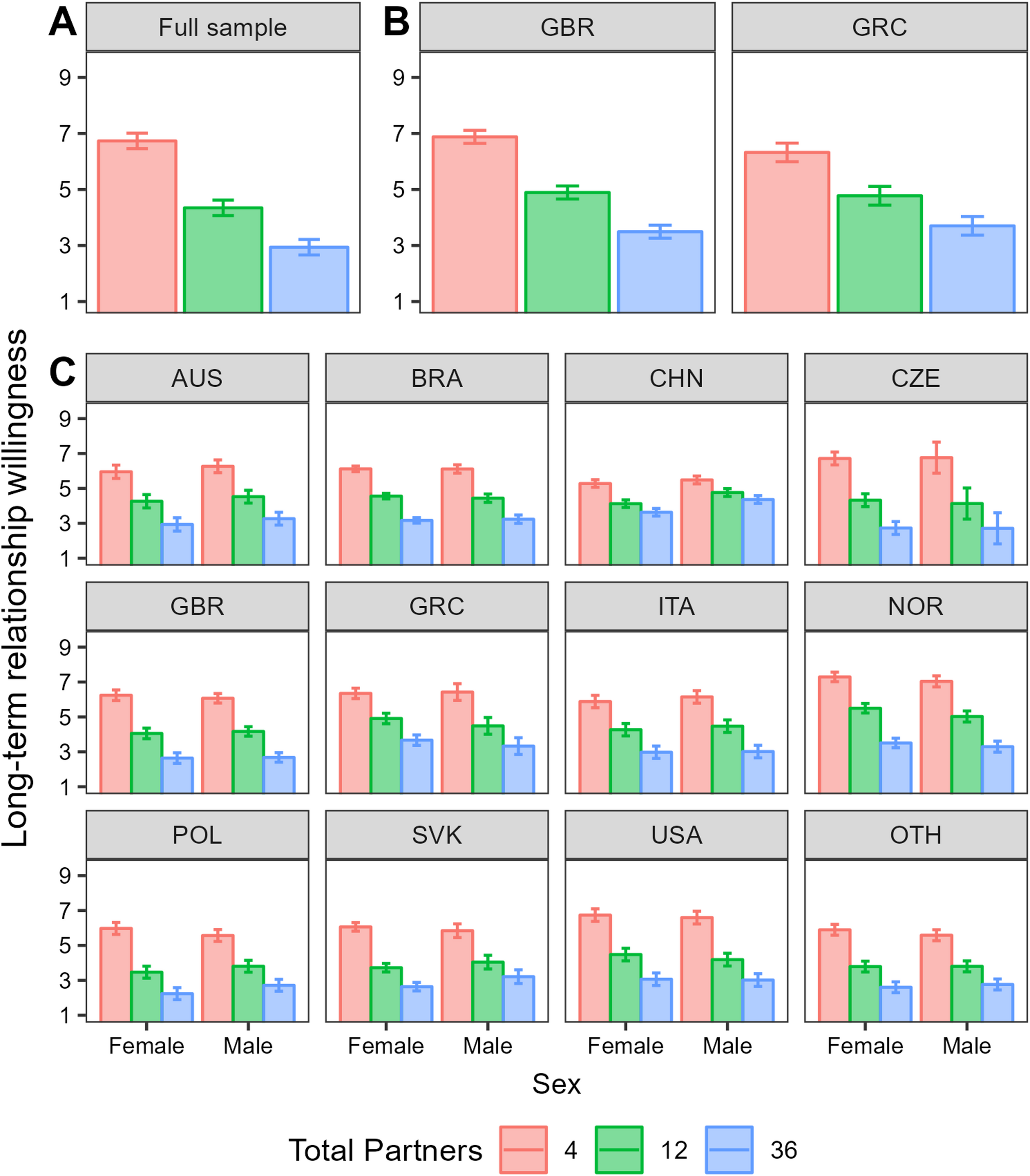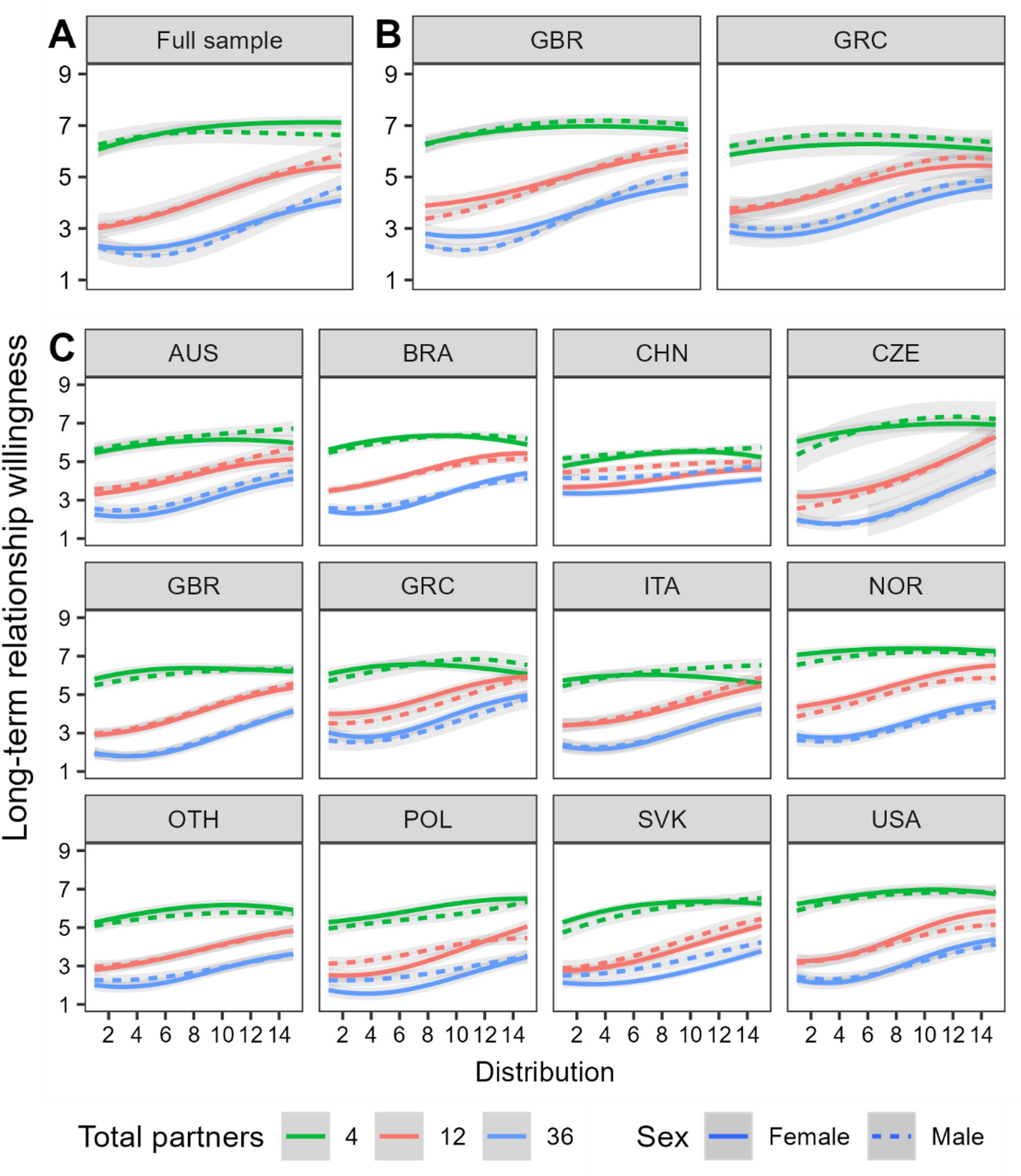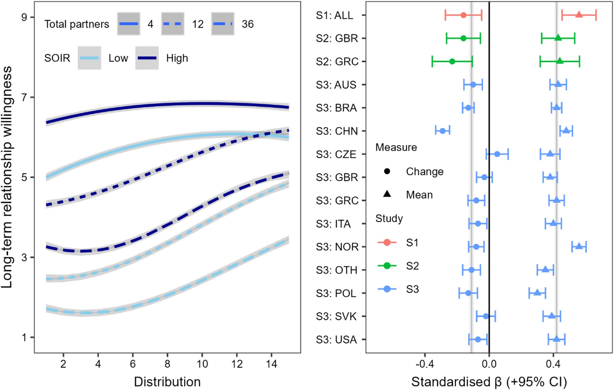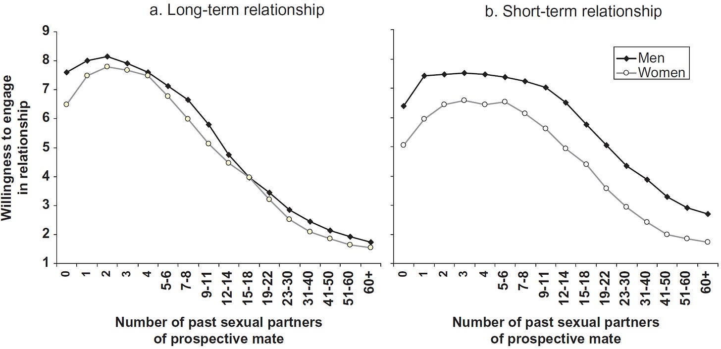 This can be seen in the next graph. The left panel shows willingness ratings for long-term relationships, the right panel for short-term ones. As you can see, the sexes barely differed in their willingness to engage in long-term relationships. For short-term relationships, in contrast, men expressed greater willingness at every past-partner level.