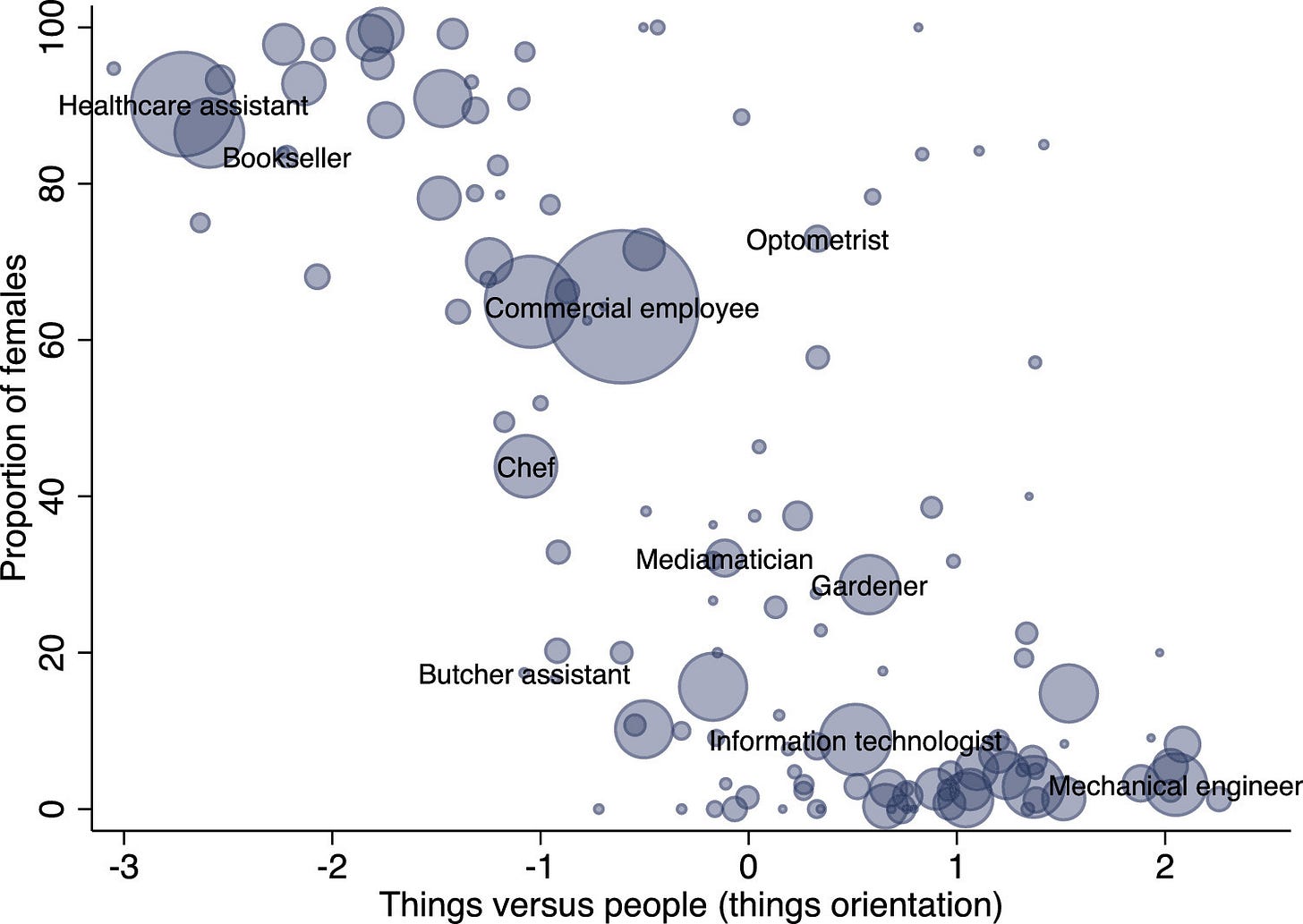 Andreas Kuhn and Stefan Wolter examined 130 apprentice occupations. Whereas most studies in the area look at people’s expressed occupational interests, this one looked at the nature of the occupations themselves - specifically, where each falls on the people-things dimension. Jobs involving machines, materials, and tools sat at one end; jobs involving care, communication, and social interaction sat at the other. The researchers then plotted each occupation’s position on this spectrum against the proportion of female apprentices.