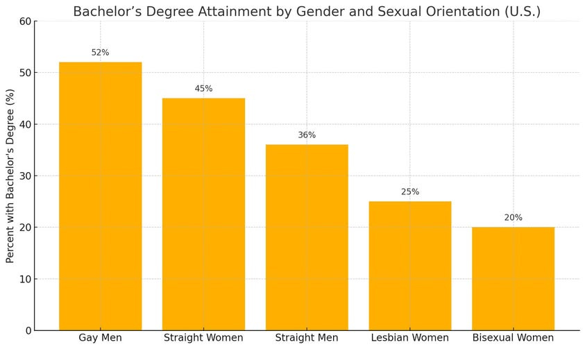 Everyone knows that men now earn fewer degrees than women. But here’s an interesting twist: Gay men earn more degrees than any other demographic (including straight women), whereas lesbians and bisexual women earn fewer degrees than any other demographic (including straight men). As the researcher who discovered this pattern, Joel Mittleman, observed, “if America’s gay men… formed their own country, it would be the world’s most highly educated by far.” [Link.]