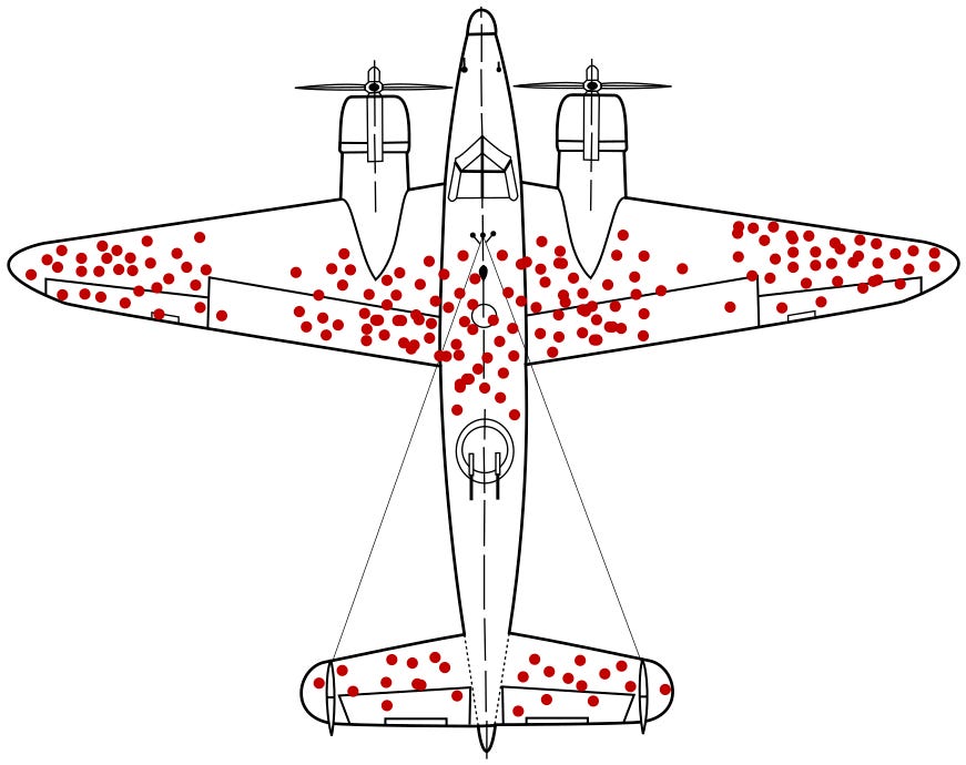Let’s kick things off with my all-time favorite example of survivorship bias. During World War II, the US military wanted to add extra armor to its bombers based on data showing where returning planes were hit most often. People usually assume that the best bet would be to reinforce those areas. But a statistician named Abraham Wald had a better idea: Reinforce the areas where the planes weren’t hit. Wald realized that the bullet holes on returning aircraft showed where a plane could take damage and still survive. The unscathed areas, in contrast, were those where, if hit, the planes never made it home. [Link.]