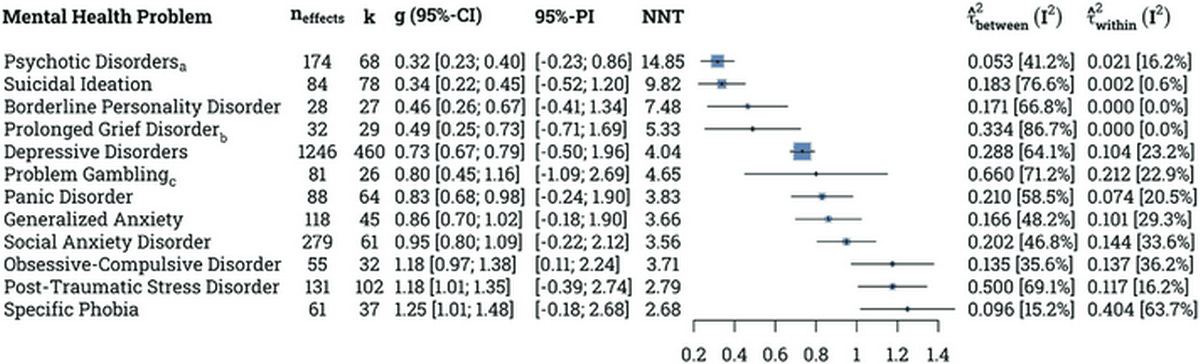 One of the reasons I decided not to become a clinical psychologist was that I worried that therapy only really works for relatively mild disorders. It looks like I wasn’t completely off base - simple phobias, for instance, are much more easily treated than full-blown psychotic disorders. But I am pleased to see that the effect sizes aren’t negligible even for some of the most serious psychiatric conditions.