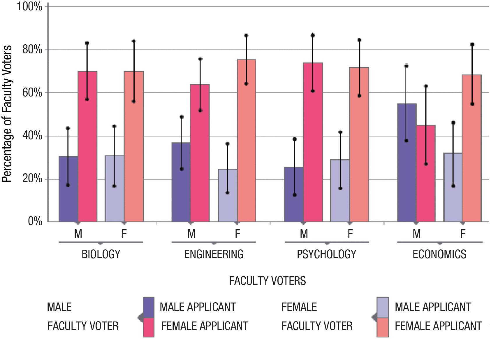 Percentage of faculty members who ranked male (M) and female (F) applicants as the top candidate, separately for male and female faculty voters in each of four disciplines. Error bars indicate ±1 standard error (SE). Adapted from Williams and Ceci (2015, Experiment 1).